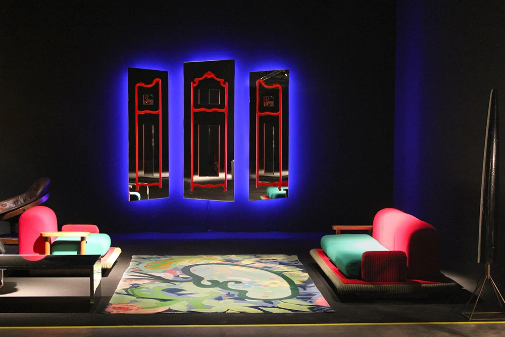 Milanese gallery once again focusing on Memphis, featuring an Ettore Sottsass’ chair and sofa that is new to me. My eyes start to glaze over when anyone mentions Memphis lately, but juxtaposed with Nanda Vigo’s mirrors and rug and the blacked out background show Sottsass’ work in a fresh light.