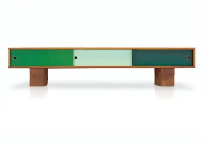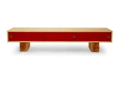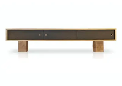 Low flung media console with three sliding doors. Sitting on scaled down beam legs, the Pawnee is perfect for media devices, such as TVs, turntables, speakers, etc. This console helps to hide the clutter that comes with these electronic devices. The Pawnee is a captivating luxury console, offered in a variety of wood and paint schemes.
